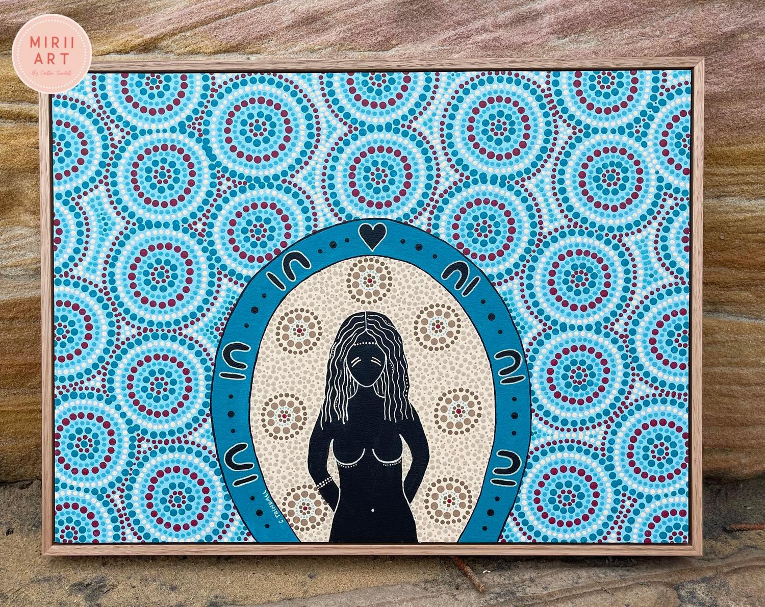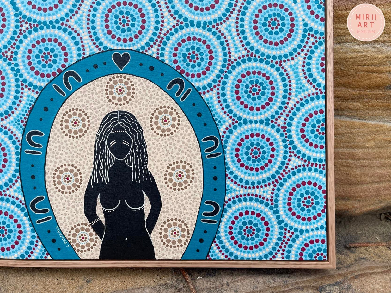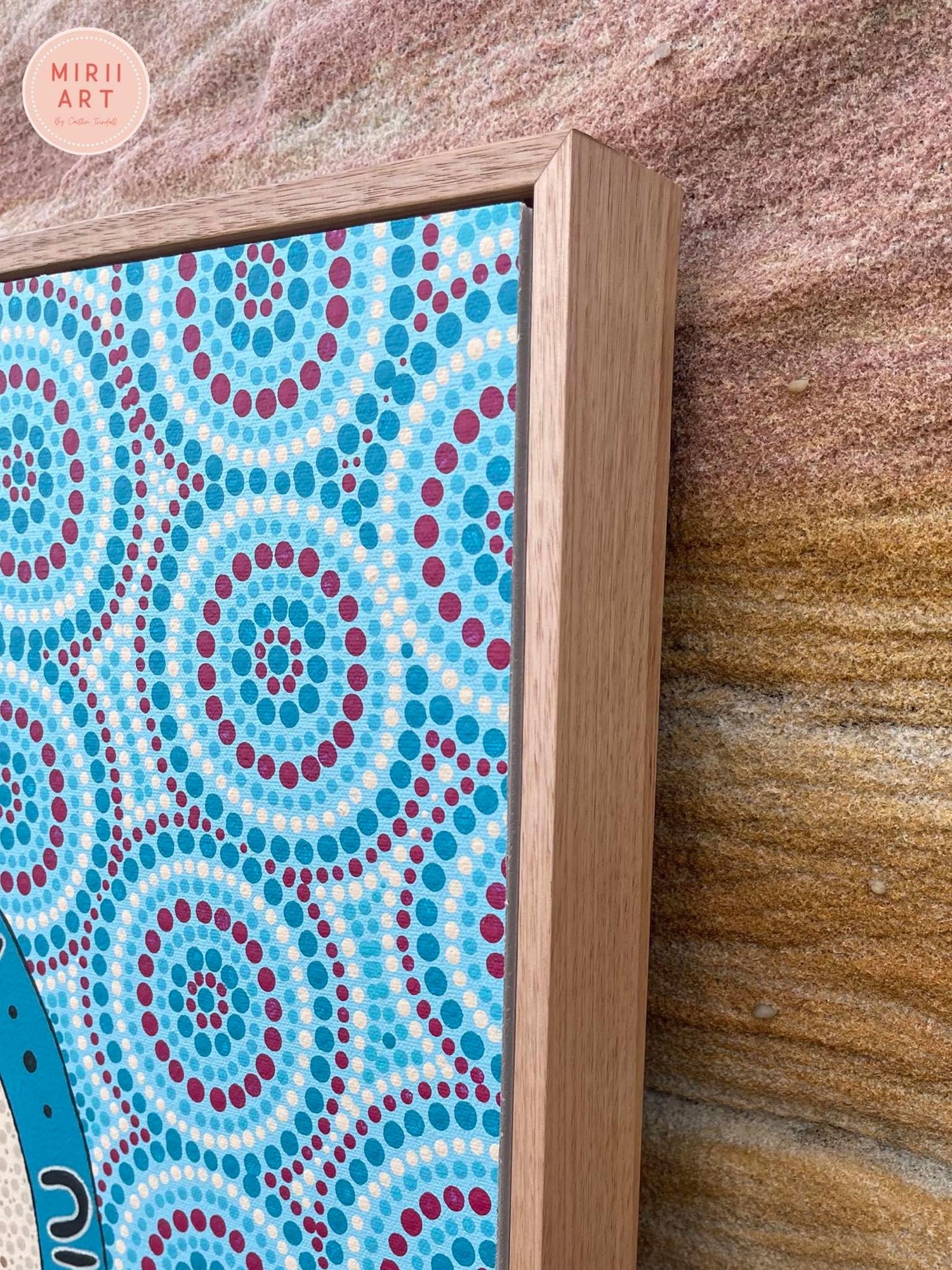 This artwork was painted using acrylic paints on canvas. The canvas has been attached to an acid-free board using acid-free glue, and then framed in a beautiful Tasmanian oak timber floating frame. The assembly is completed with framers tape and is strung ready to hang.